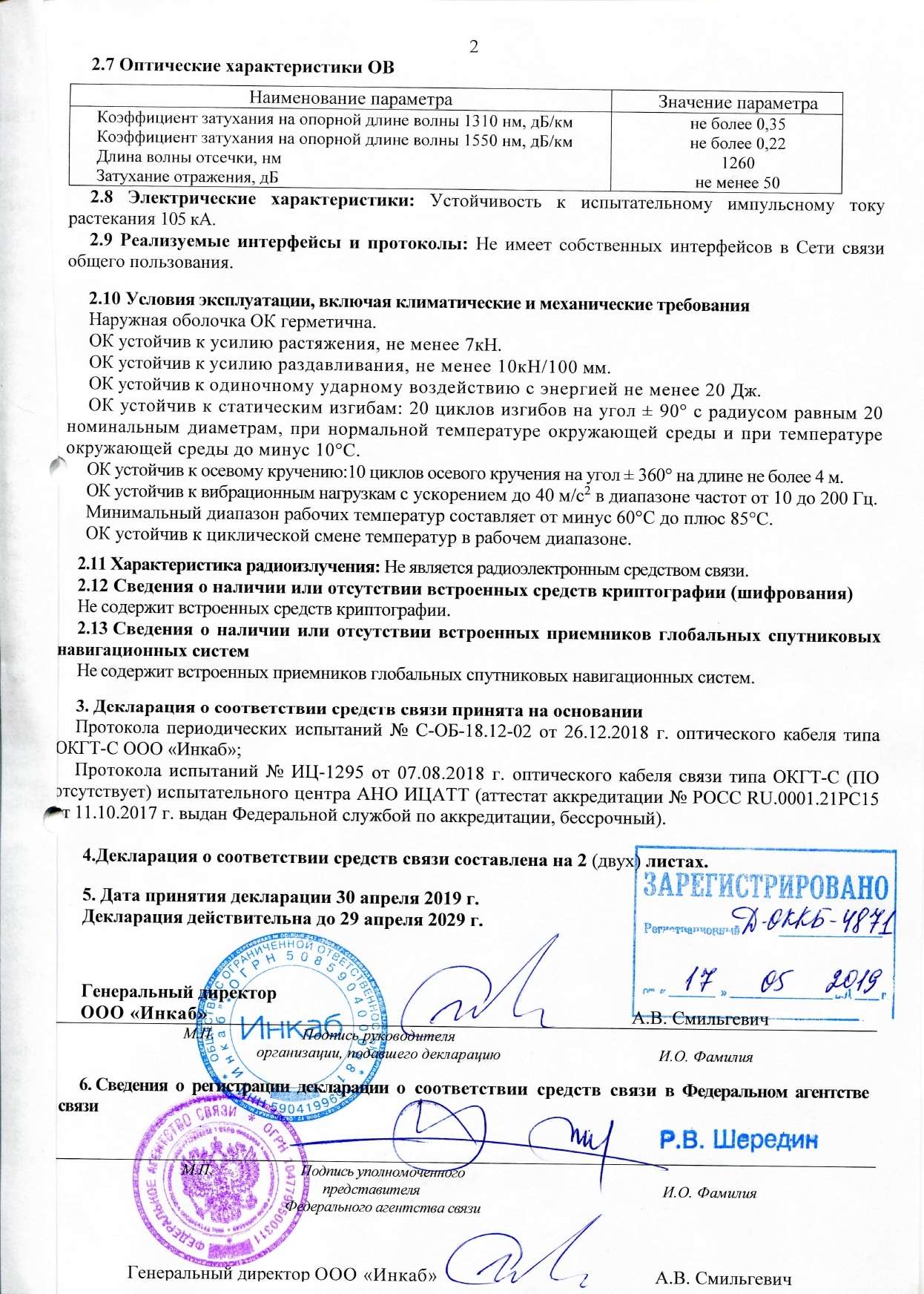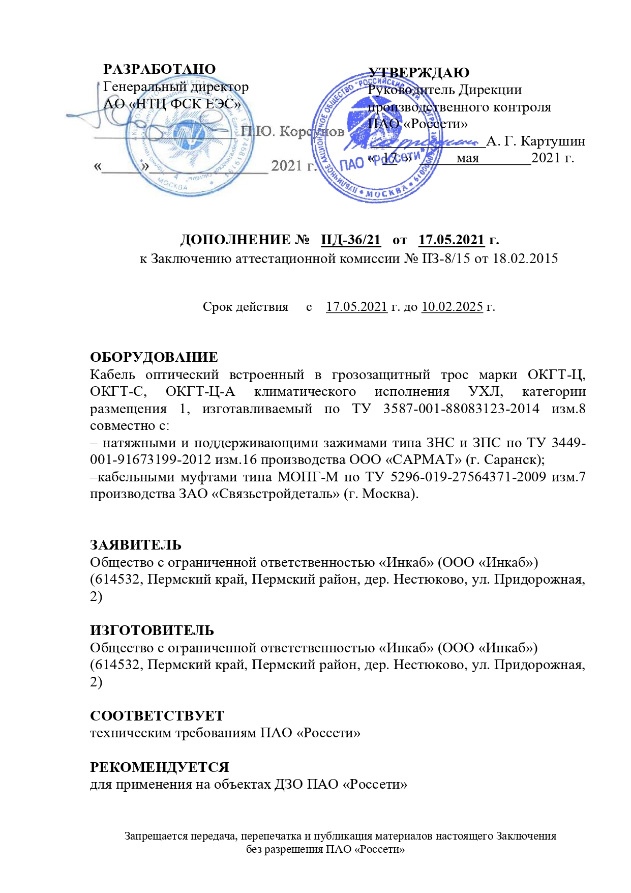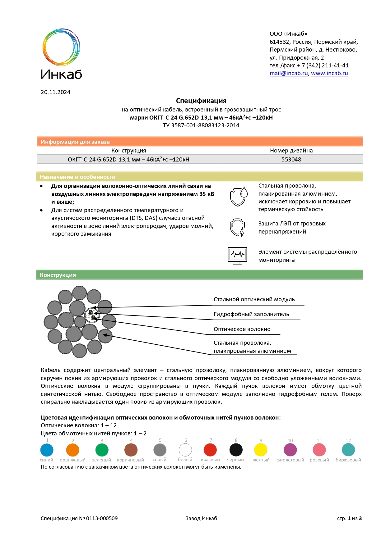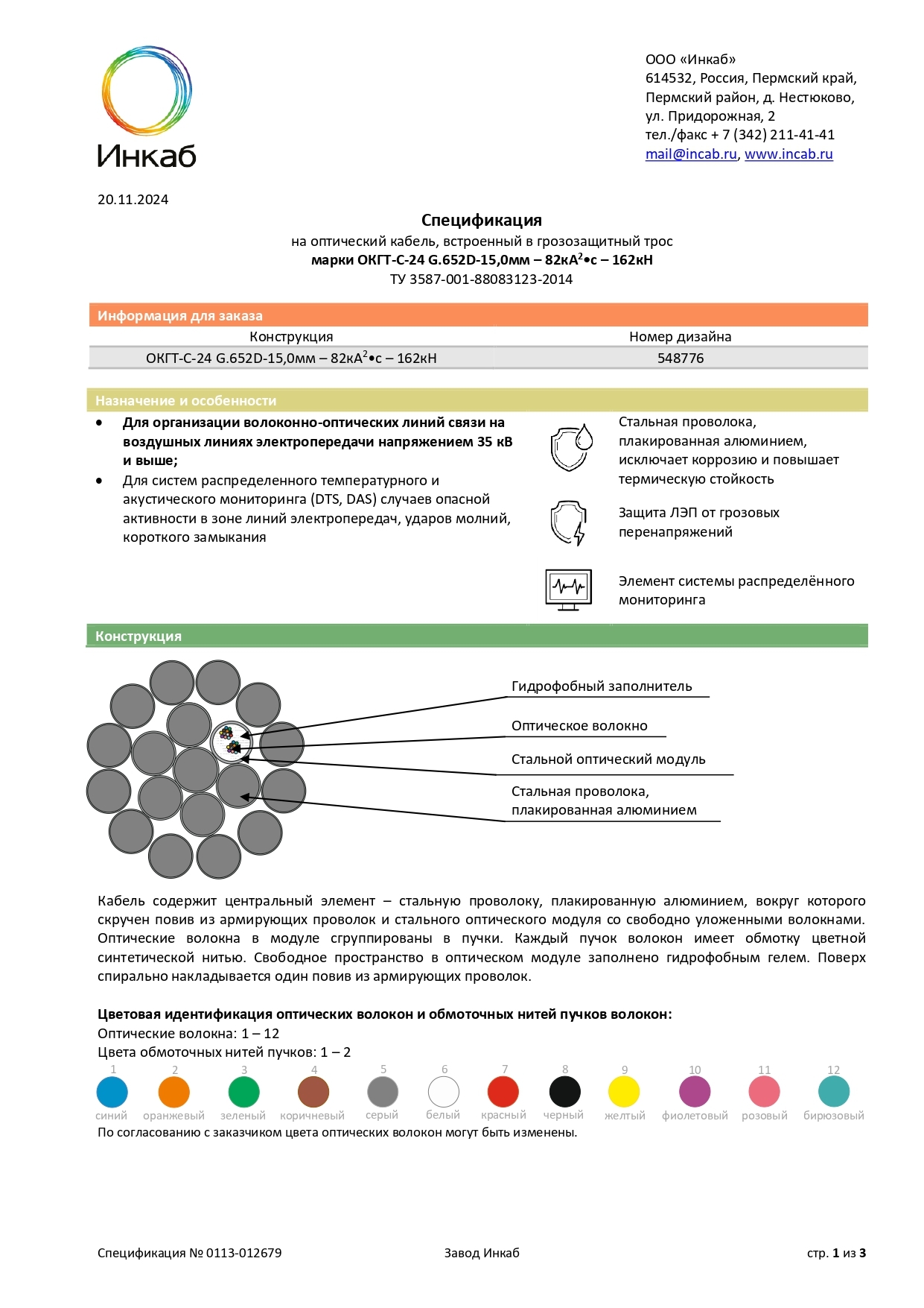 Применение: в воздушных линиях электропередачи напряжением 35 кВ и выше в качестве кабеля-датчика для систем распределенного температурного и акустического мониторинга (DTS, DAS) случаев опасной активности в зоне линий электропередач, ударов молний, короткого замыкания.