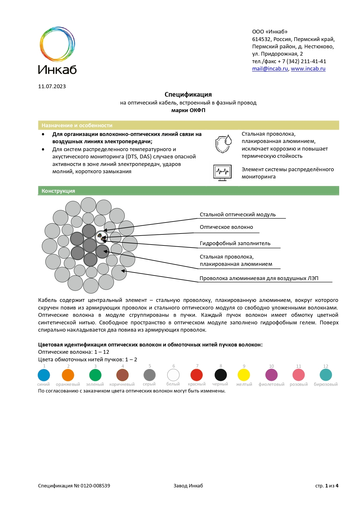 Применение: в воздушных линиях электропередачи напряжением 35 кВ и выше в качестве кабеля-датчика для систем распределенного температурного и акустического мониторинга (DTS, DAS) случаев опасной активности в зоне линий электропередач, ударов молний, короткого замыкания.