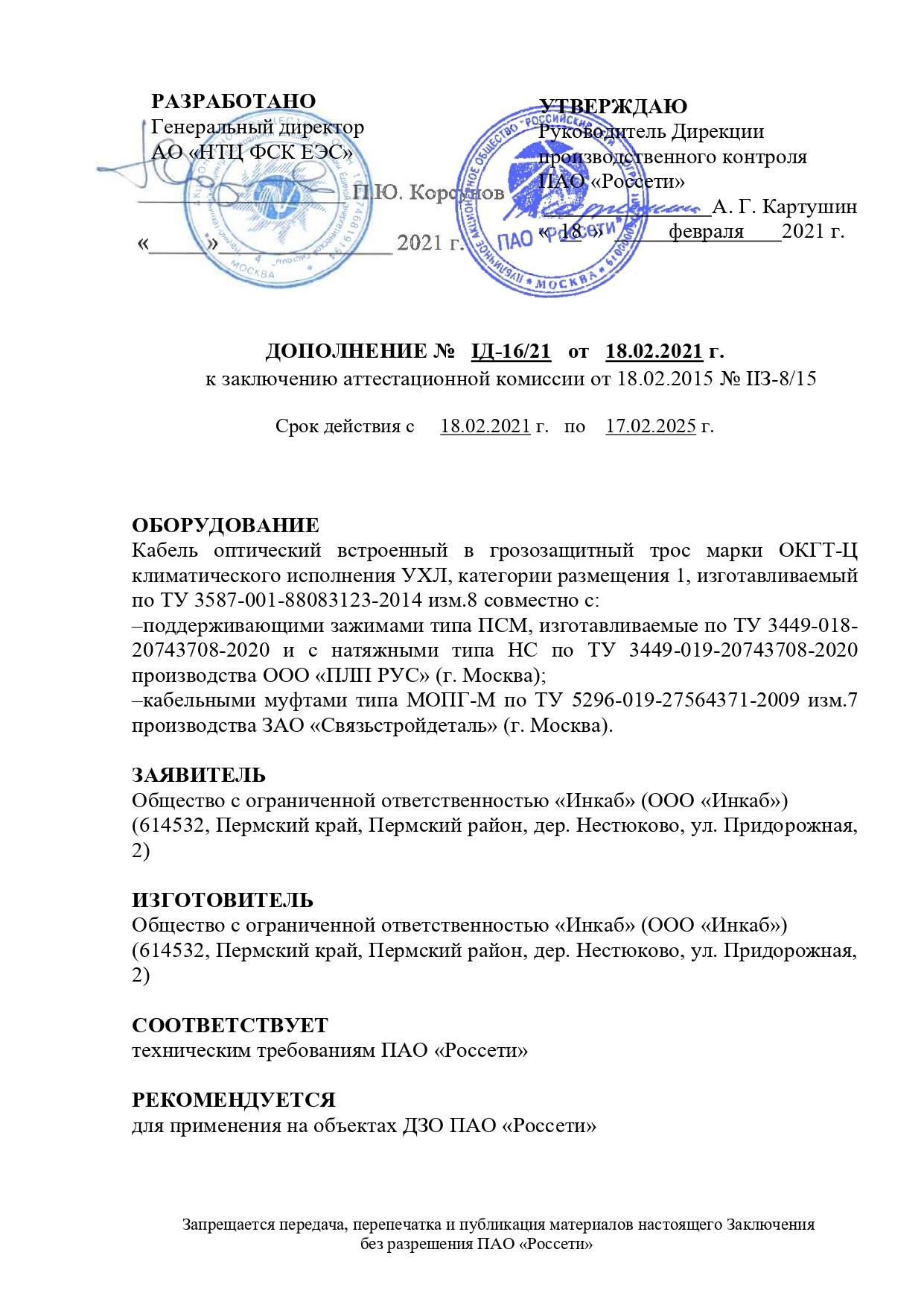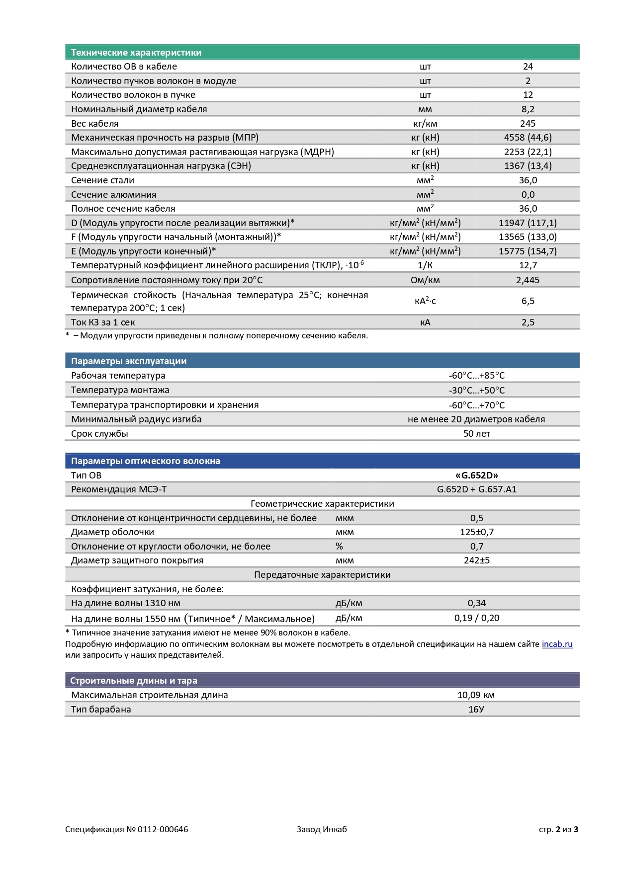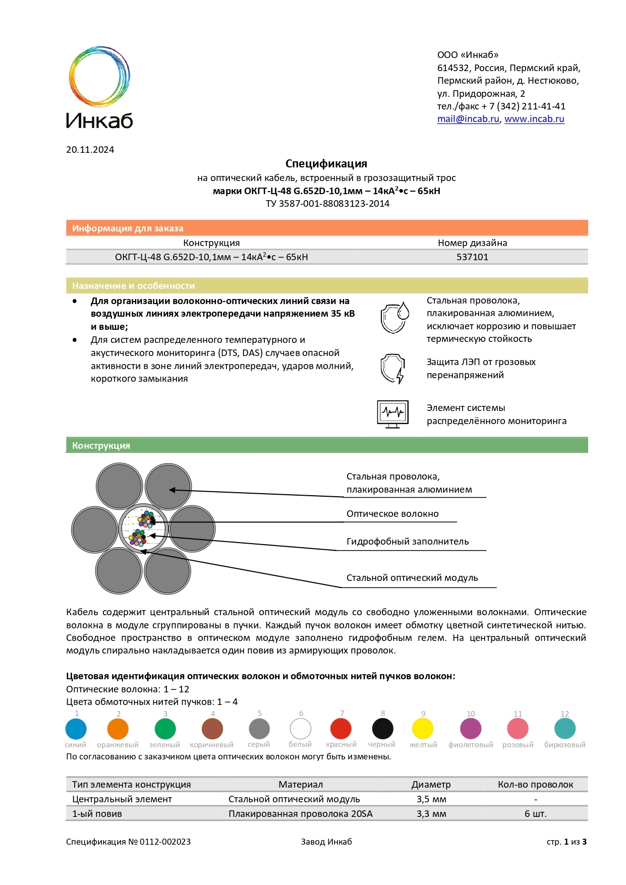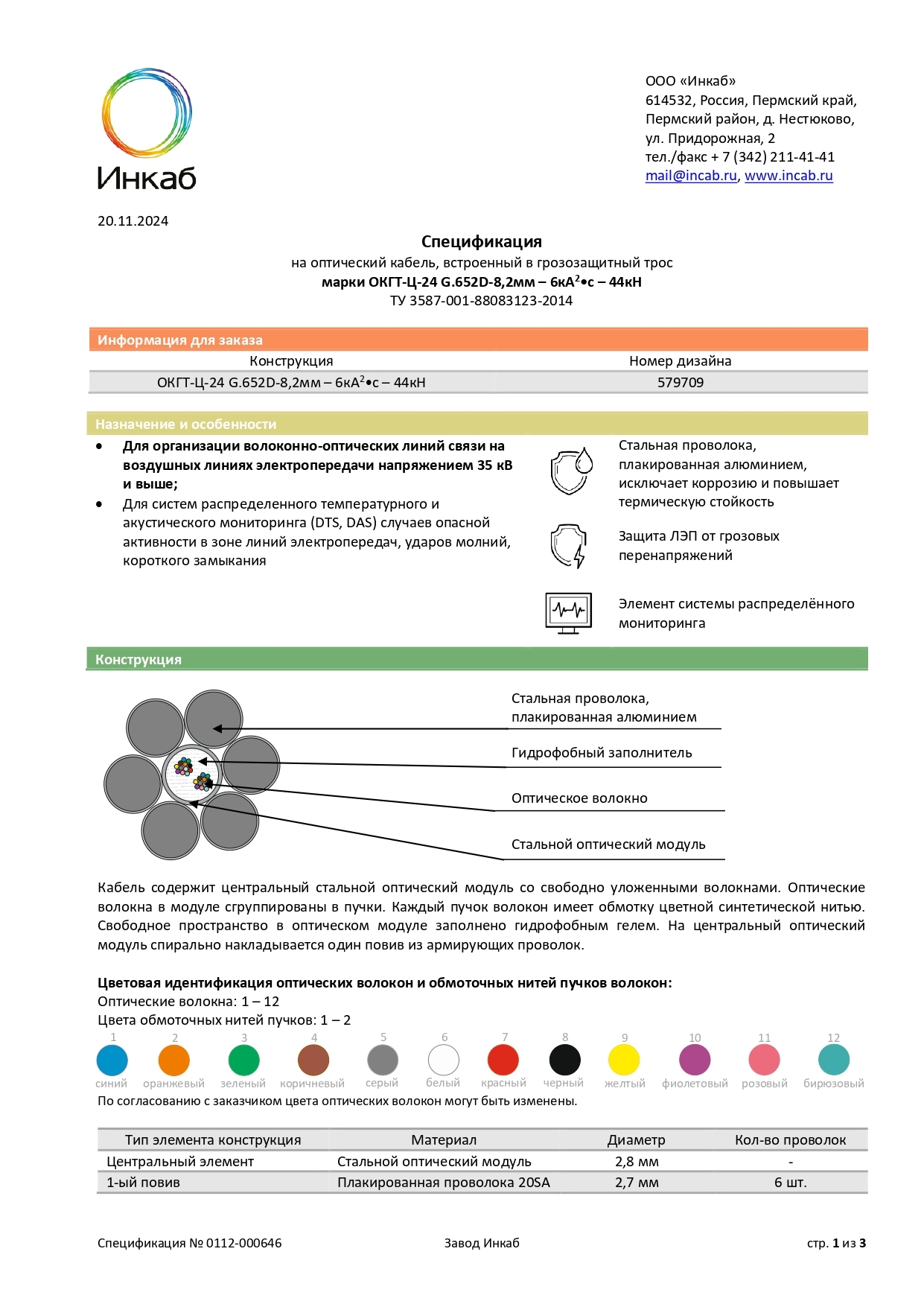 Применение: в воздушных линиях электропередачи напряжением 35 кВ и выше в качестве кабеля-датчика для систем распределенного температурного и акустического мониторинга (DTS, DAS) случаев опасной активности в зоне линий электропередач, ударов молний, короткого замыкания.