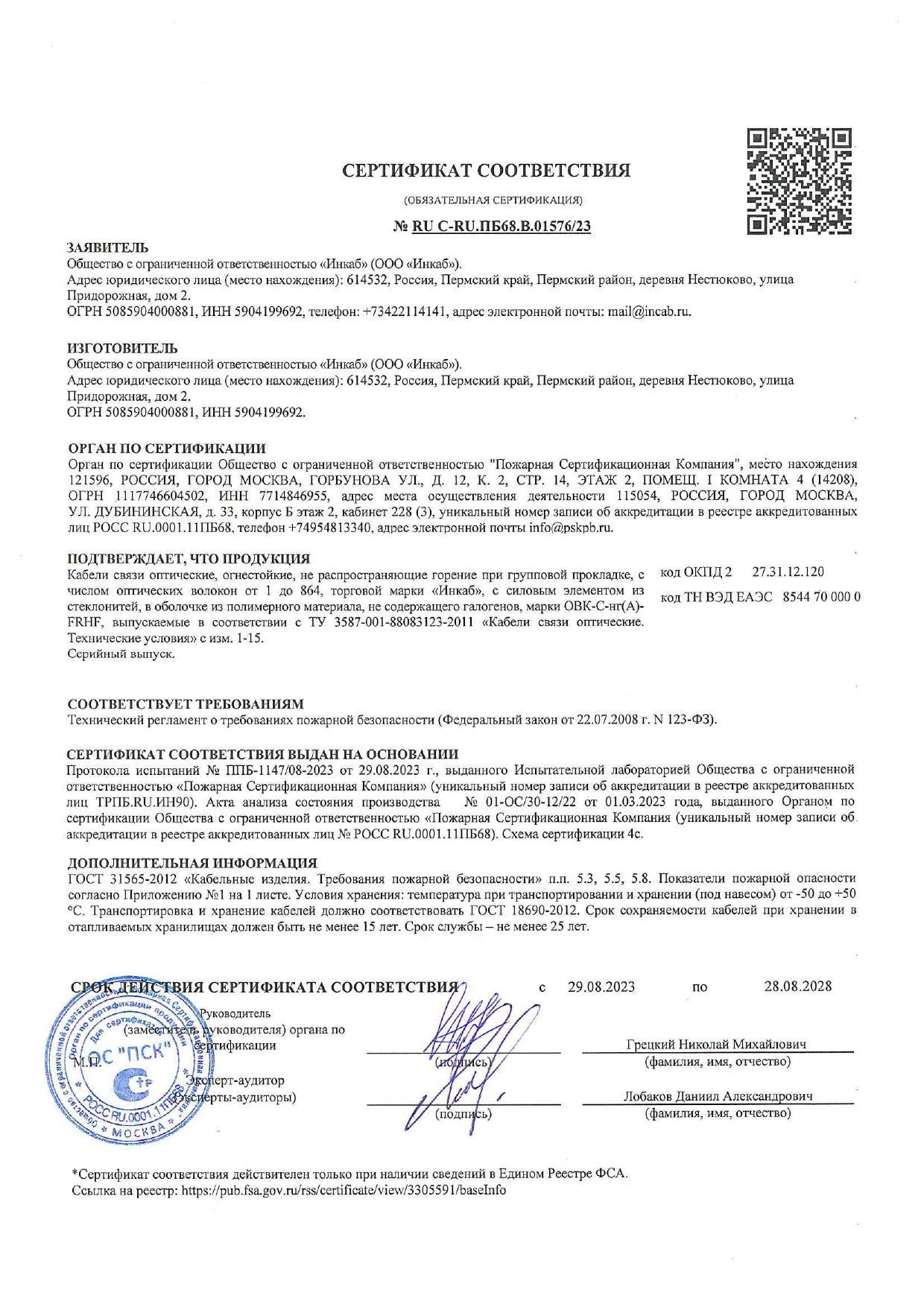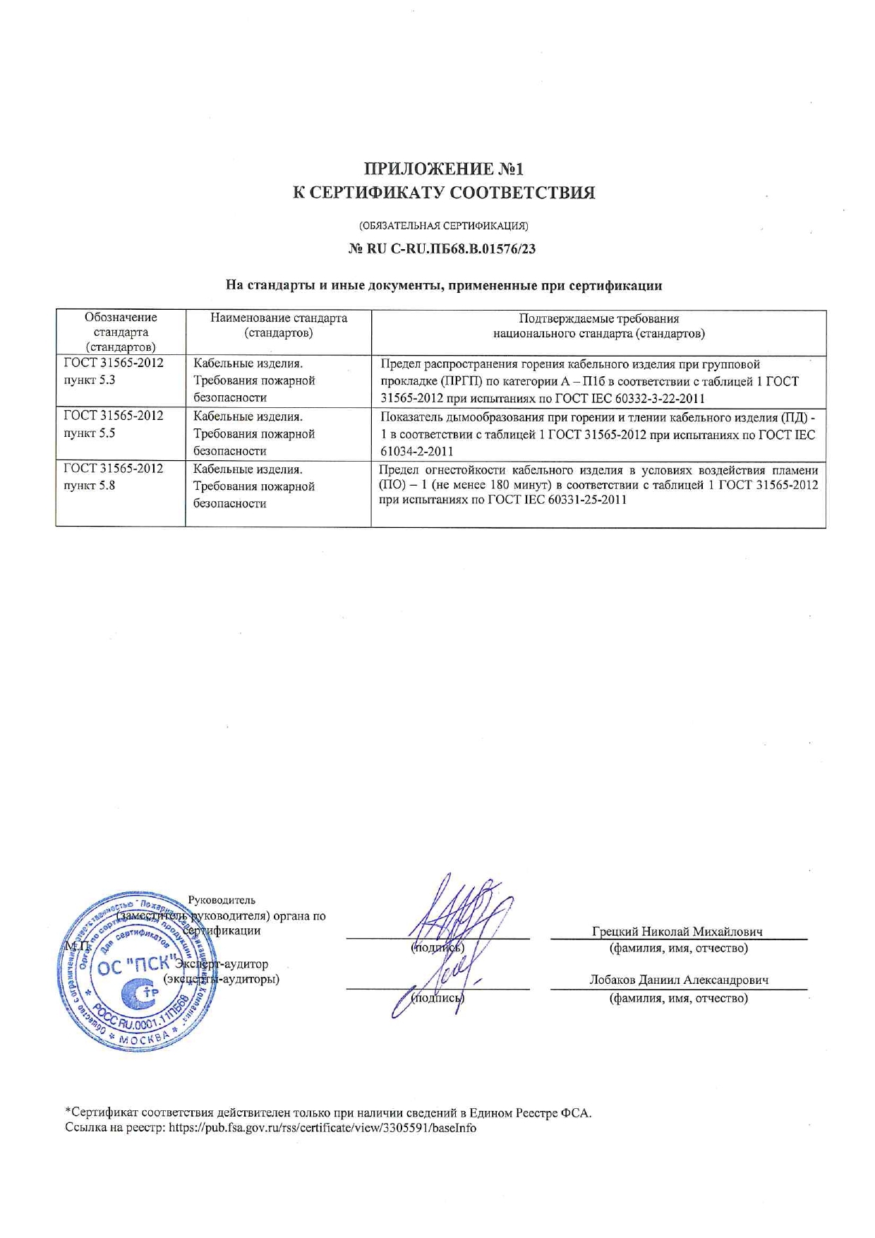 Сертификат пожарной безопасности (групповая прокладка; огнестойкие, малодымные, безгалогенные, низкотоксичные (-нг(А)-FRHF)