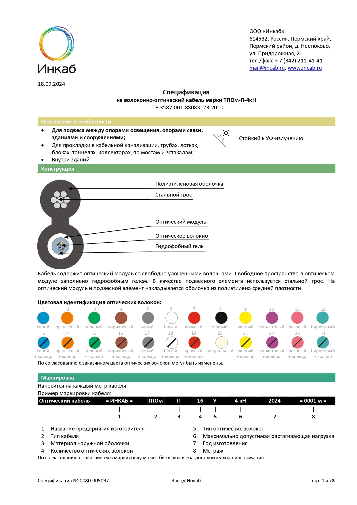 ТПОм – легкая одномодульная конструкция со стальным тросом или диэлектрическим стержнем. Несмотря на уменьшенный вес и габариты ТПОм выдерживает те же растягивающие нагрузки, что и многомодульные конструкции. Центральный оптический модуль может содержать не более 24 свободно уложенных волокон. Применение: подвес между опорами освещения, опорами связи, зданиями и сооружениями; в кабельную канализацию, трубы, блоки, лотки, тоннели, эстакады, мосты, коллекторы, внутри зданий.