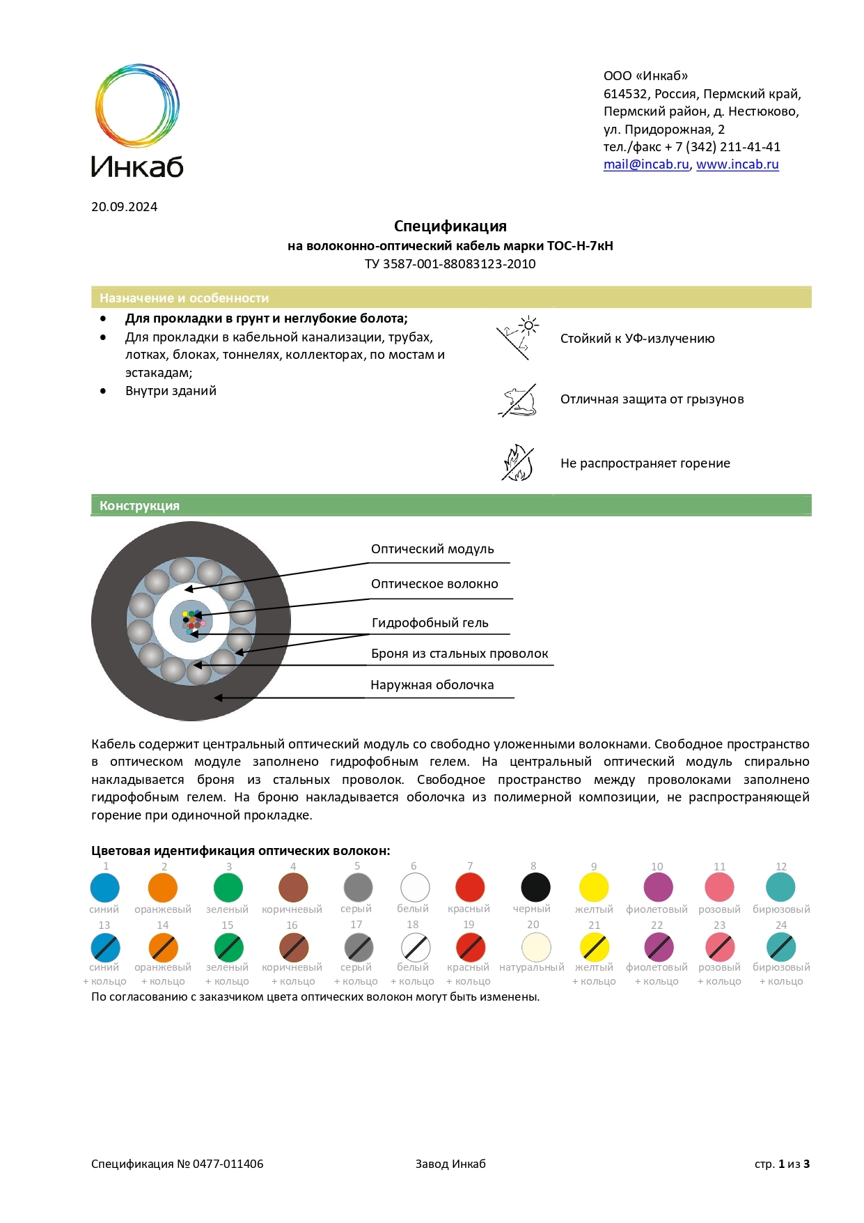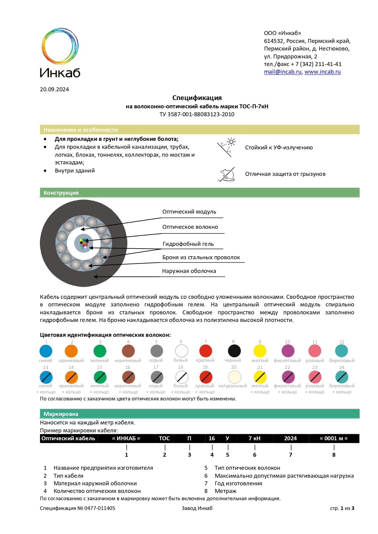 ТОС — легкий (с центральным оптическим модулем (до 24 ОВ) без промежуточной оболочки). Применение: в грунт и неглубокие болота; в кабельную канализацию, трубы, блоки, лотки, тоннели, эстакады, мосты, коллекторы, внутри зданий.