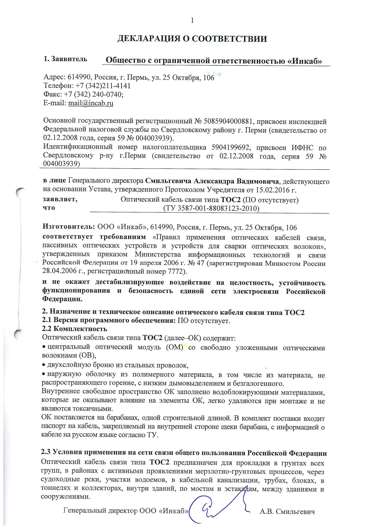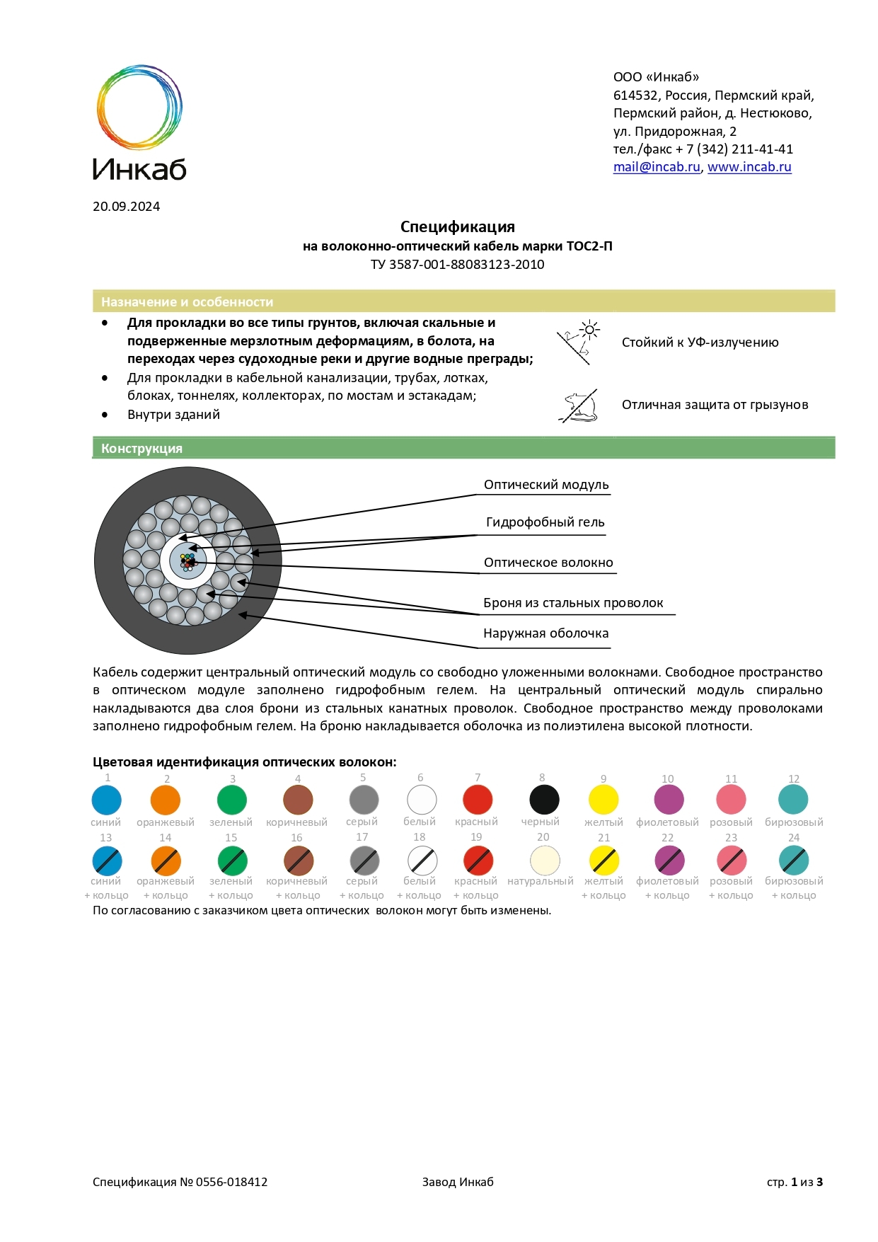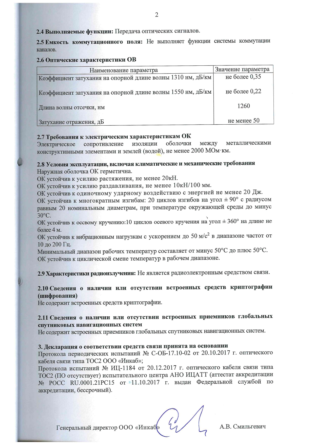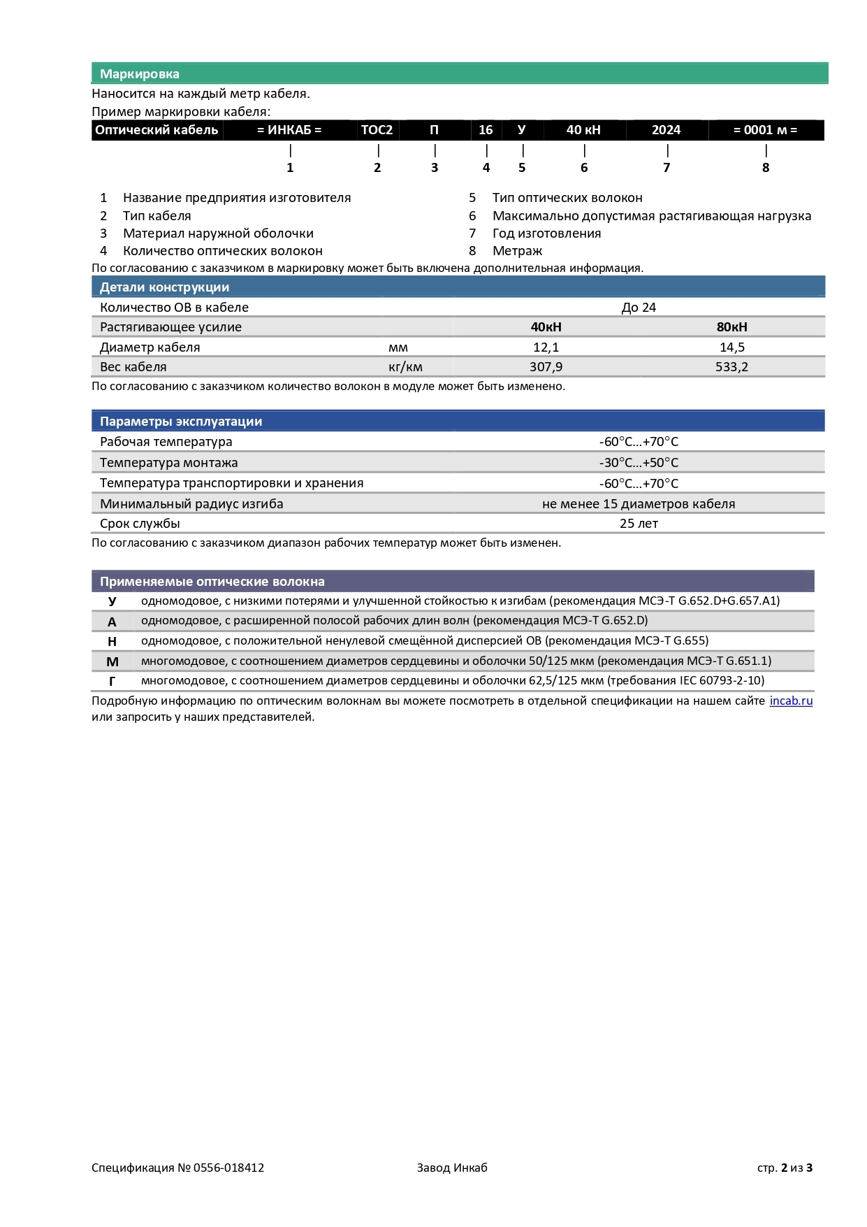 ТОС2 — кабель с центральным оптическим модулем без промежуточной оболочки с двойной броней для прокладки в сложный грунт. Применение: во все типы грунтов, включая скальные и подверженные мерзлотным деформациям, в болота, на переходах через судоходные реки и другие водные преграды; в кабельную канализацию, трубы, блоки, лотки, тоннели, эстакады, мосты, коллекторы, внутри зданий.