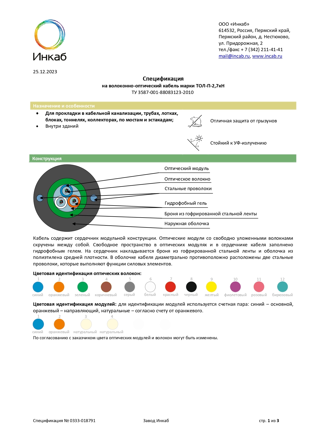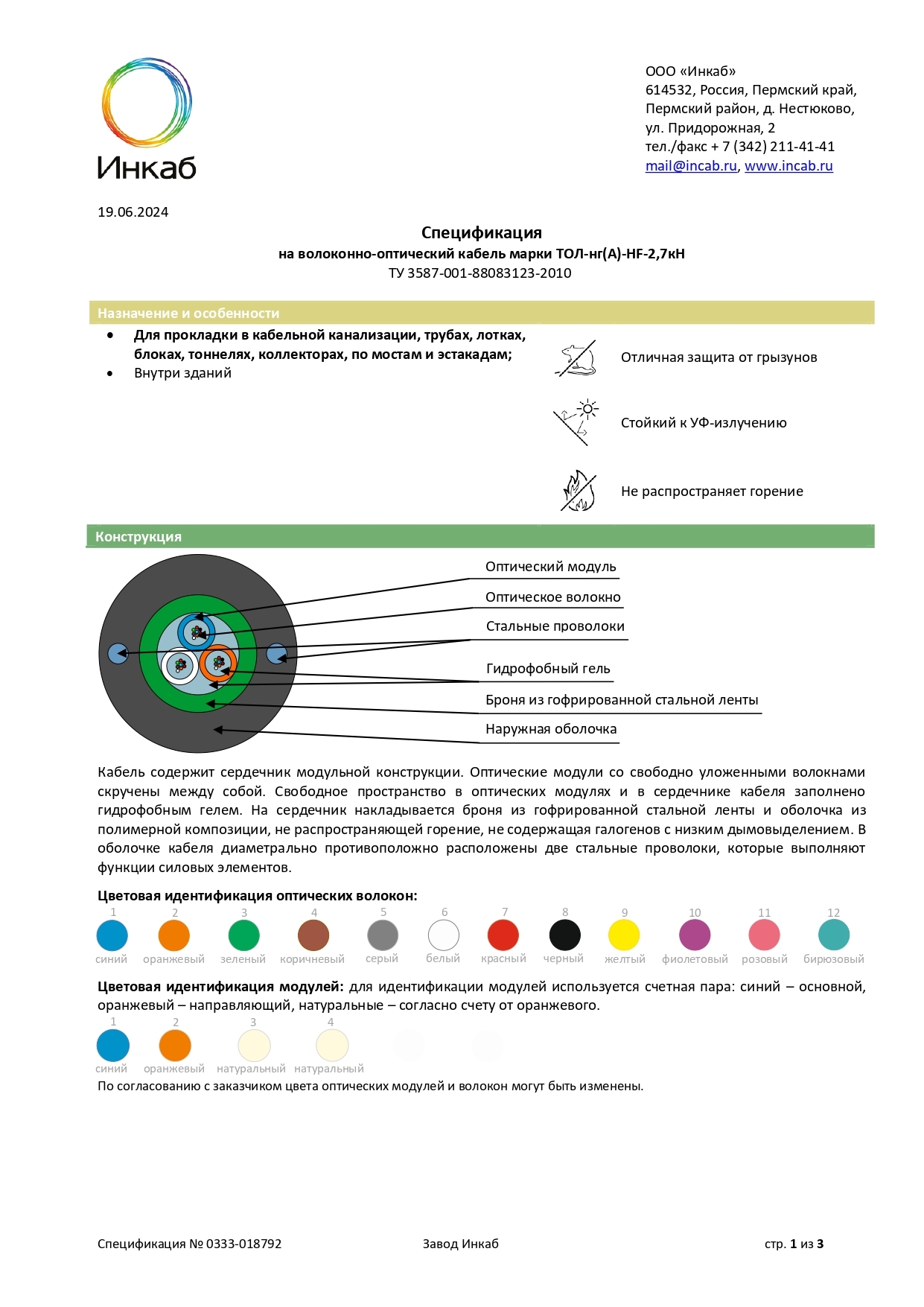 Возможно изготовление конструкции для одиночной прокладки (в оболочке –н-) и для групповой прокладки с низким дымо- и газовыделением, безгалогенные (в оболочке –нг(А)-HF).