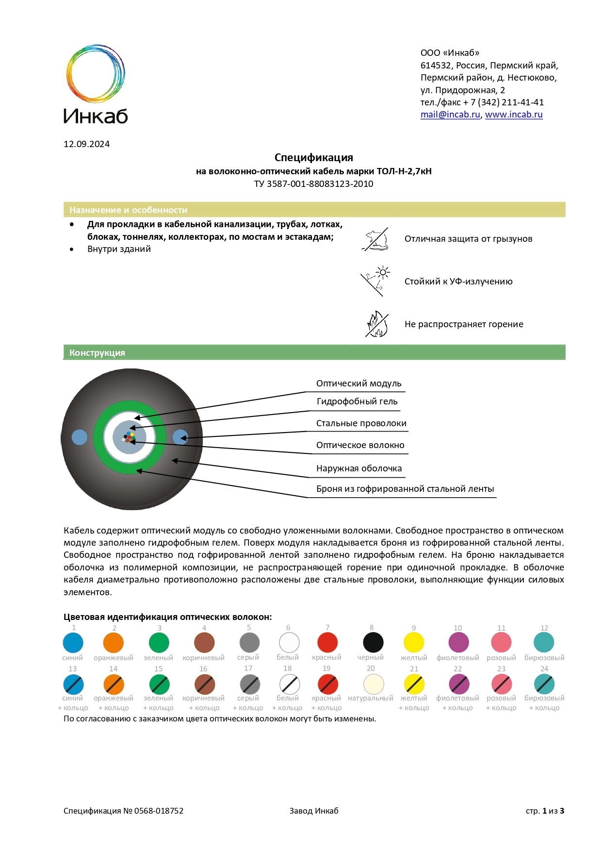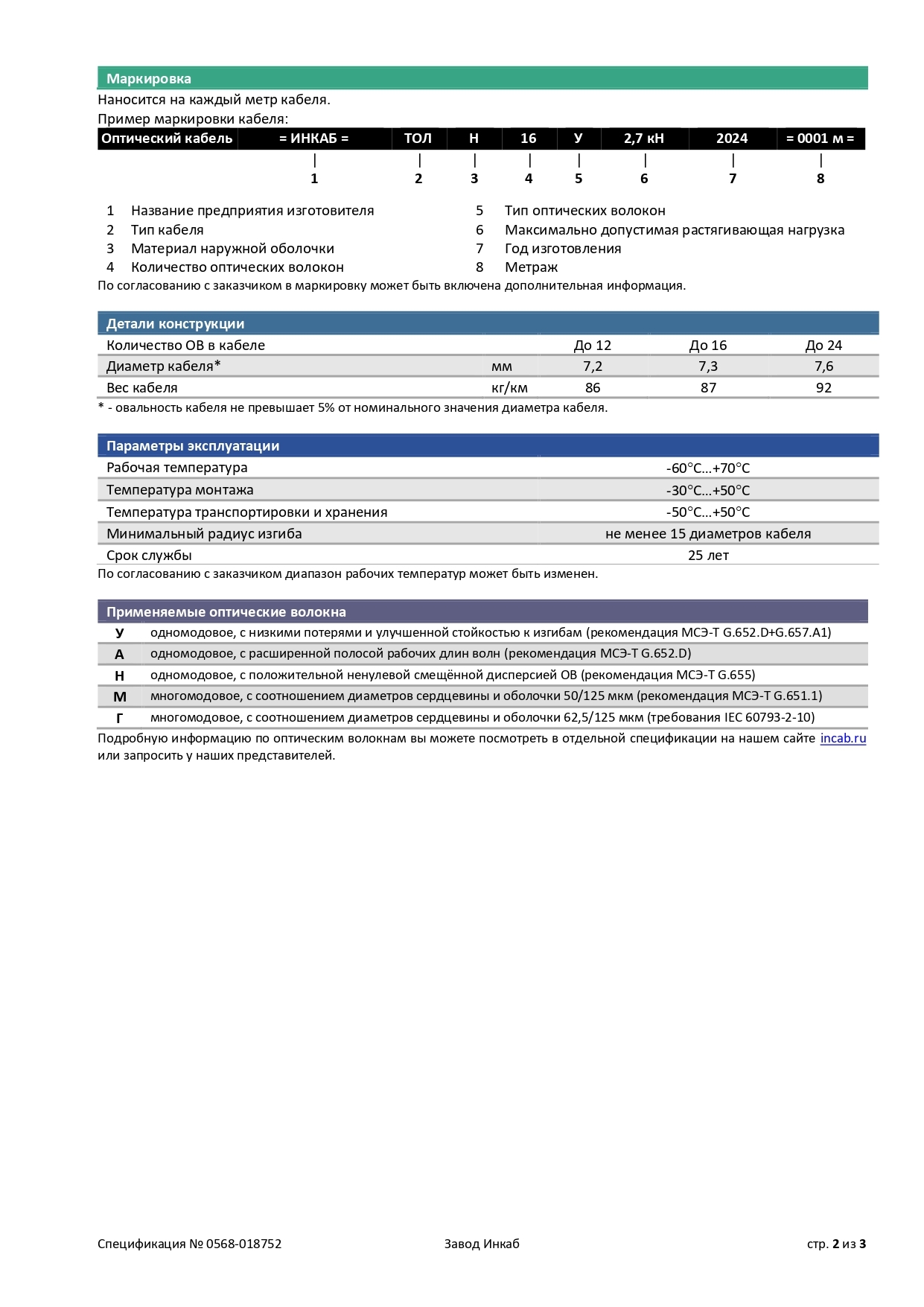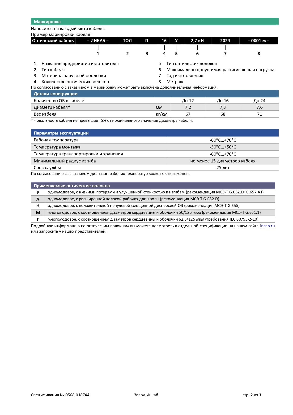 Легкий кабель без промежуточной оболочки, усилен двумя стальными проволоками, впаянными в оболочку. Выпускается с центральным оптическим модулем (до 24 волокон) – ТОЛ, и ТОЛ модульный– со скруткой модулей без центрального силового элемента (до 48 волокон). Экономичные конструкции с уменьшенным весом и размером. Применение: в кабельную канализацию, трубы, блоки, лотки, тоннели, эстакады, мосты, коллекторы, внутри зданий.