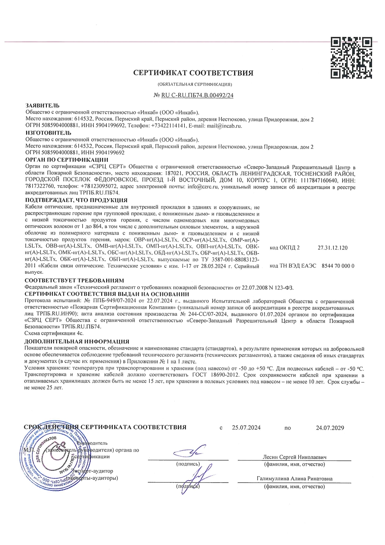 Сертификат пожарной безопасности № СС RU С-RU.ПБ74.В.00492/24 на локальные LSLTx до 24.07.29