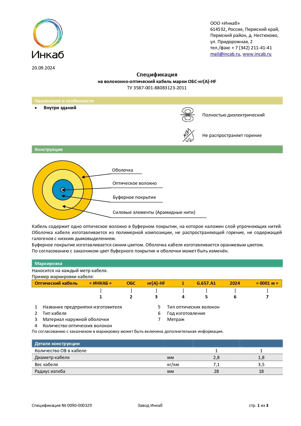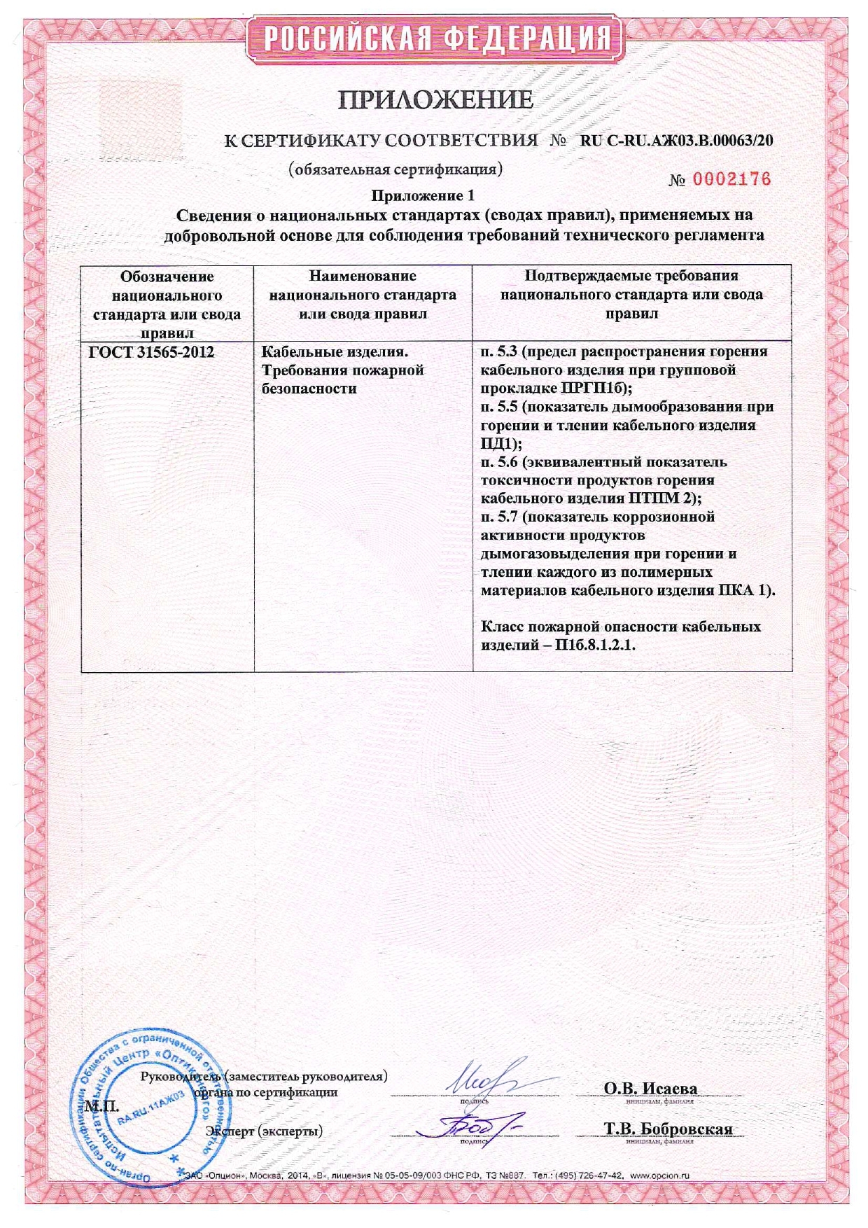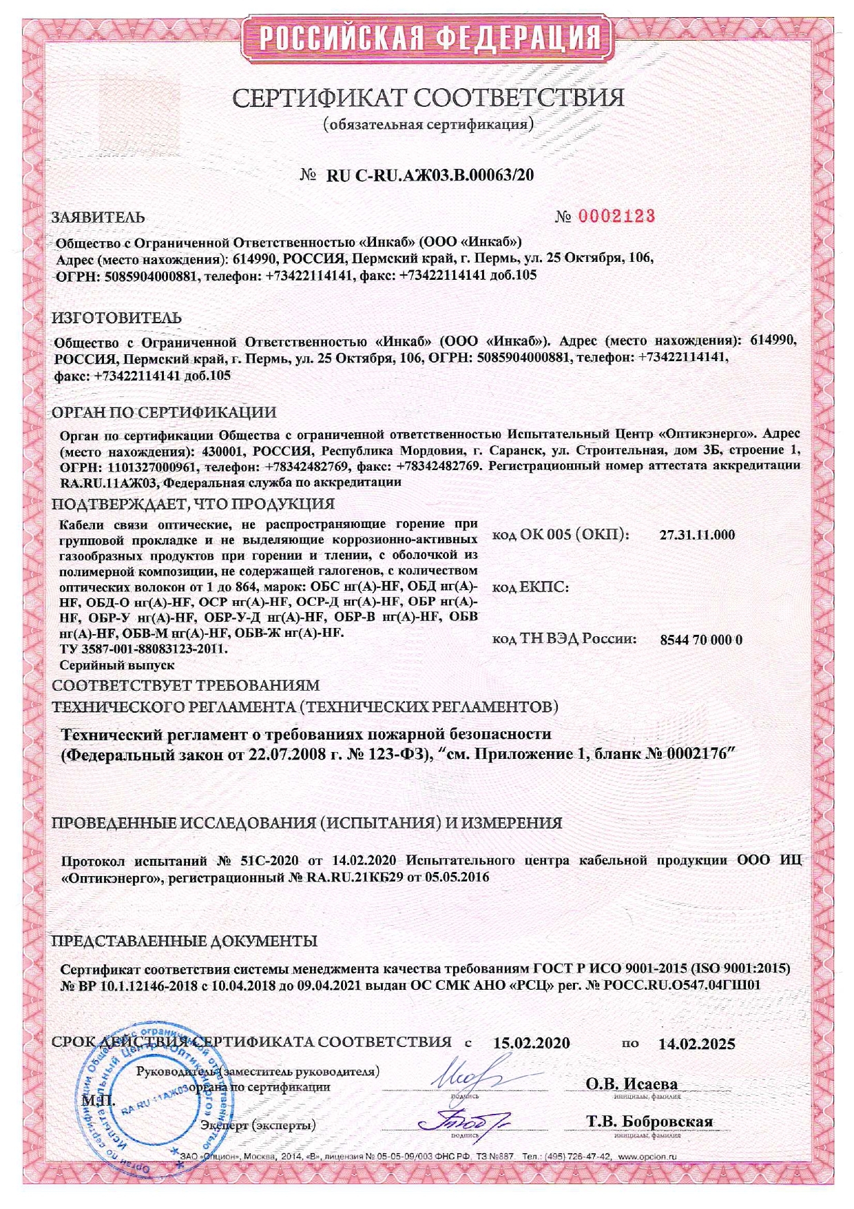 Сертификат пожарной безопасности (групповая прокладка; малодымные, безгалогенные (-нг(А)-HF)) № С-RU.АЖ03.В.00063/20 от 15.02.2020